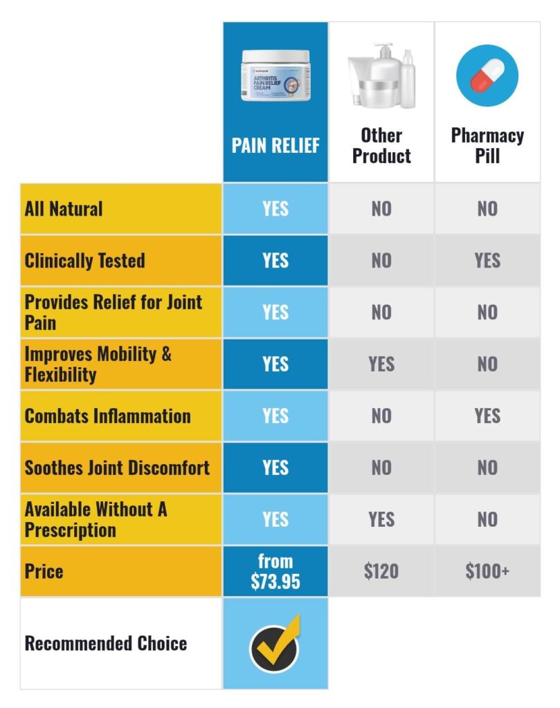 Not all joint pain relief options are the same. While pills may come with unwanted side effects and generic creams lack potency, Arthrovit Cream stands out with its natural, clinically tested ingredients and fast-absorbing formula. See how it compares to typical pharmacy pills and other over-the-counter products — and why it’s the smart, effective choice for long-lasting joint comfort.e